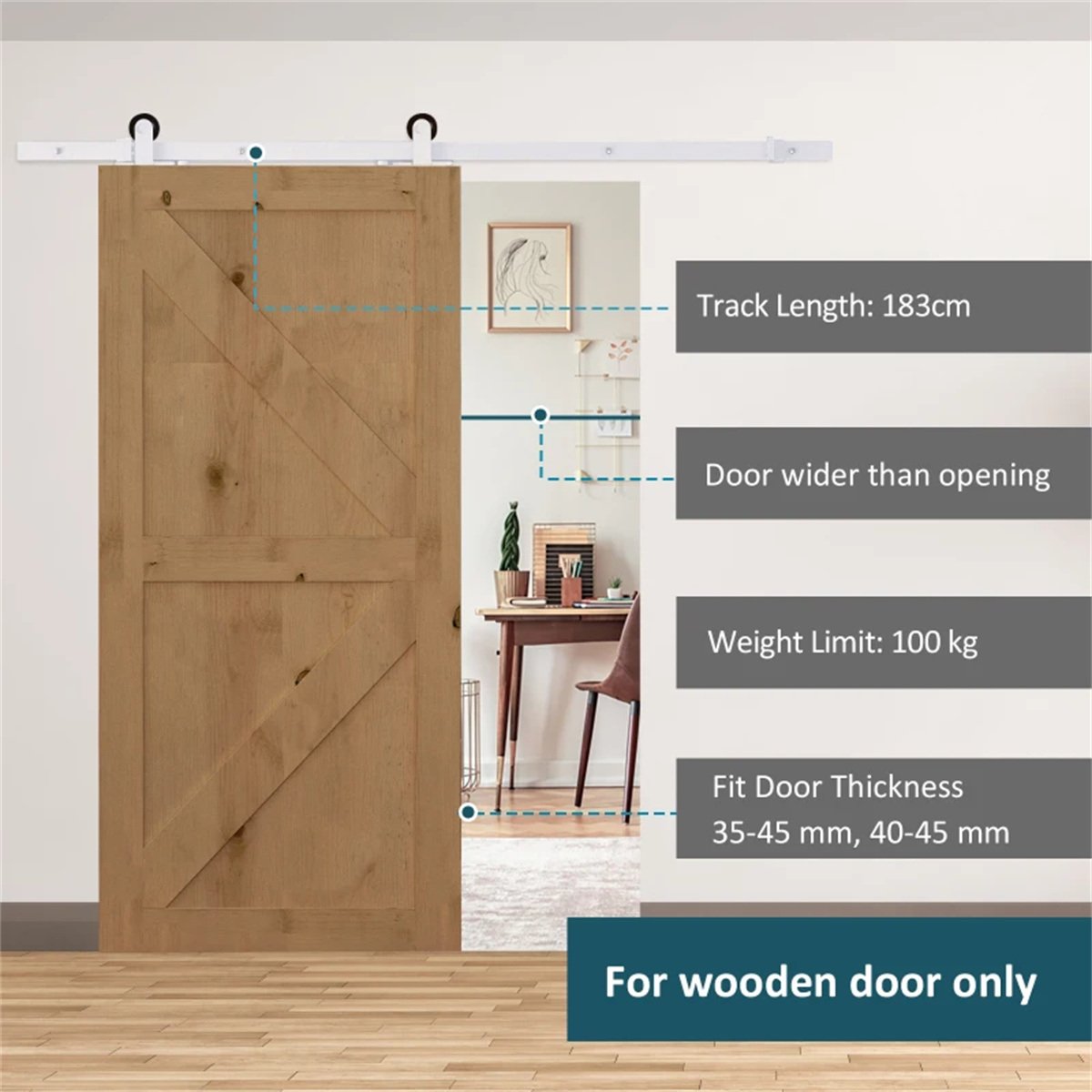 - Maximum Door Weight Capacity: 220 lbs.  - Includes: 1 x Sliding Rail, 2 x Rollers, 2 x Door Stoppers