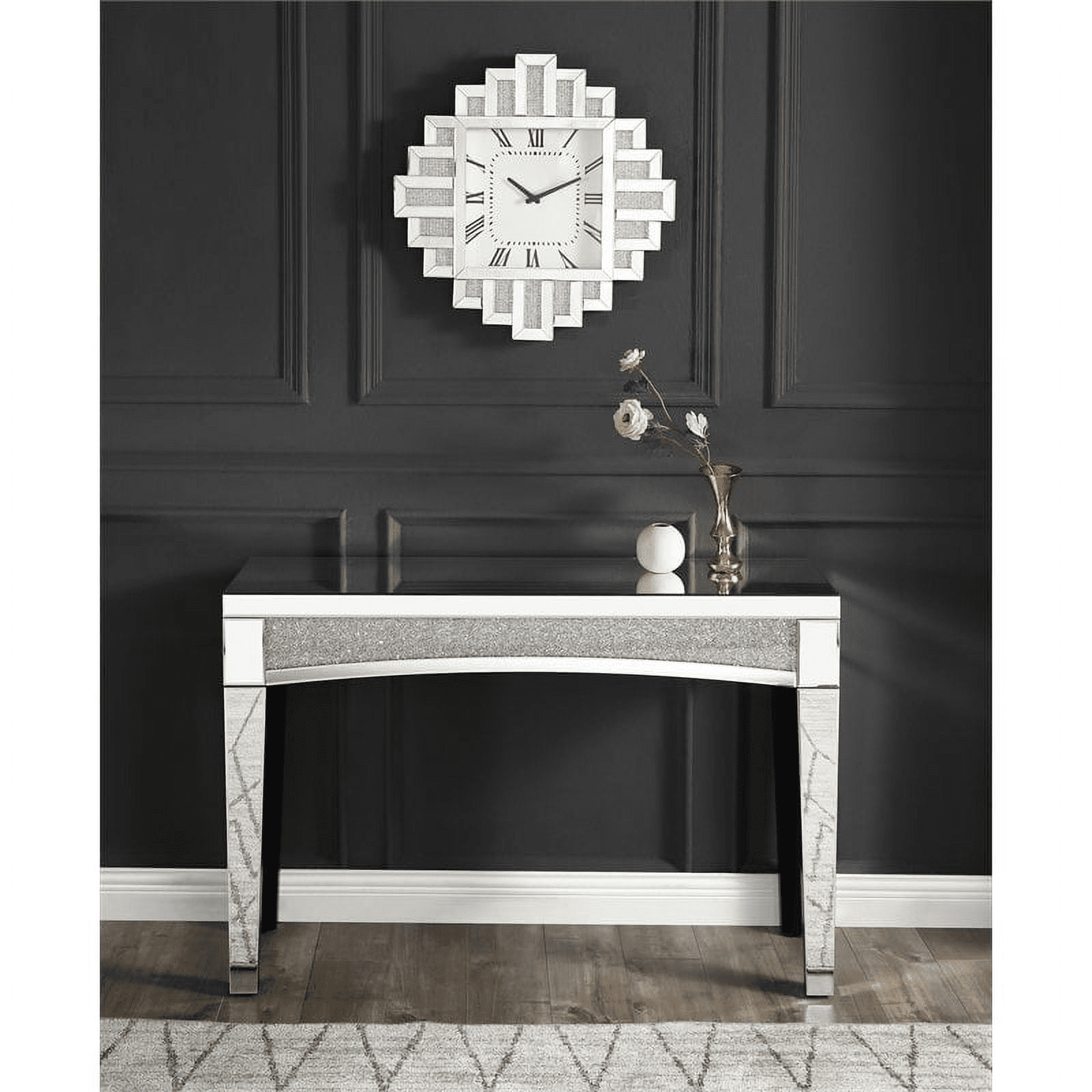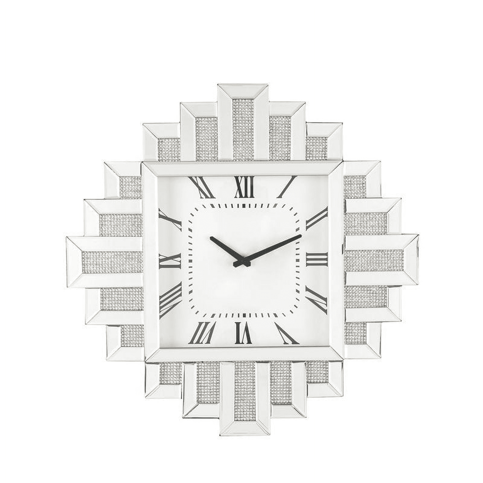 This lavina irregular wall clock is covered in beveled mirrored panels that highlight its glamorous style. Featuring crushed acrylic faux diamonds that will naturally attract the eye. Durable engineered wood supports the frame. The clockface comes with a timeless roman numeral design.