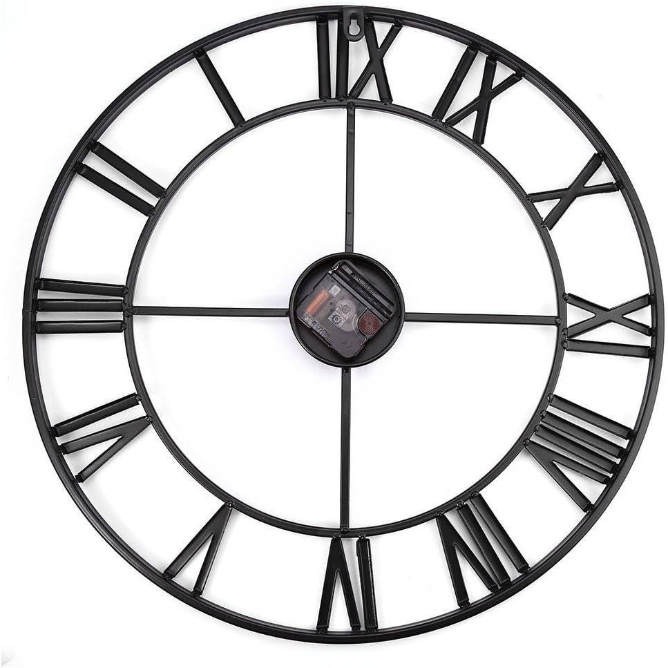 This Decorative 18.5-inch Roman Numerals Silent Non-Ticking Wall Clock in Gold is an oversized iron wall clock with European retro style and no frame surface. Enjoy a vintage display on the wall with a fashion pattern available, best decoration. Diameter: 18.5”(47cm) Classic and elegant and looks great on the wall of the living room, bedroom, kitchen, hallway, office, study, cafe, hotel, restaurant etc. Handmade iron metal, classic industrial Roman Numerals, with hand painted vintage color. Famous Qualify Quartz Sweep Movement and no second design guarantees accurate time & absolutely silent environment. Recommended AA ordinary Carbon Zinc or Heavy Duty battery (NOT Included), excluding Alkaline battery.