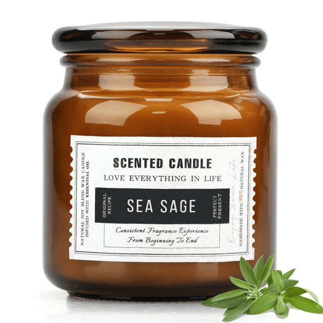 [sea sage scented candle]: packed in a vintage gift box. Top notes: orange, bergamot; middle notes: rose, lily of the valley; base notes: cedar, ambergris. Lid noise reduction design optimized the defects of traditional glass lids. Amber jar coordinate with furniture well also as decorative candles. Looks and smells decent.