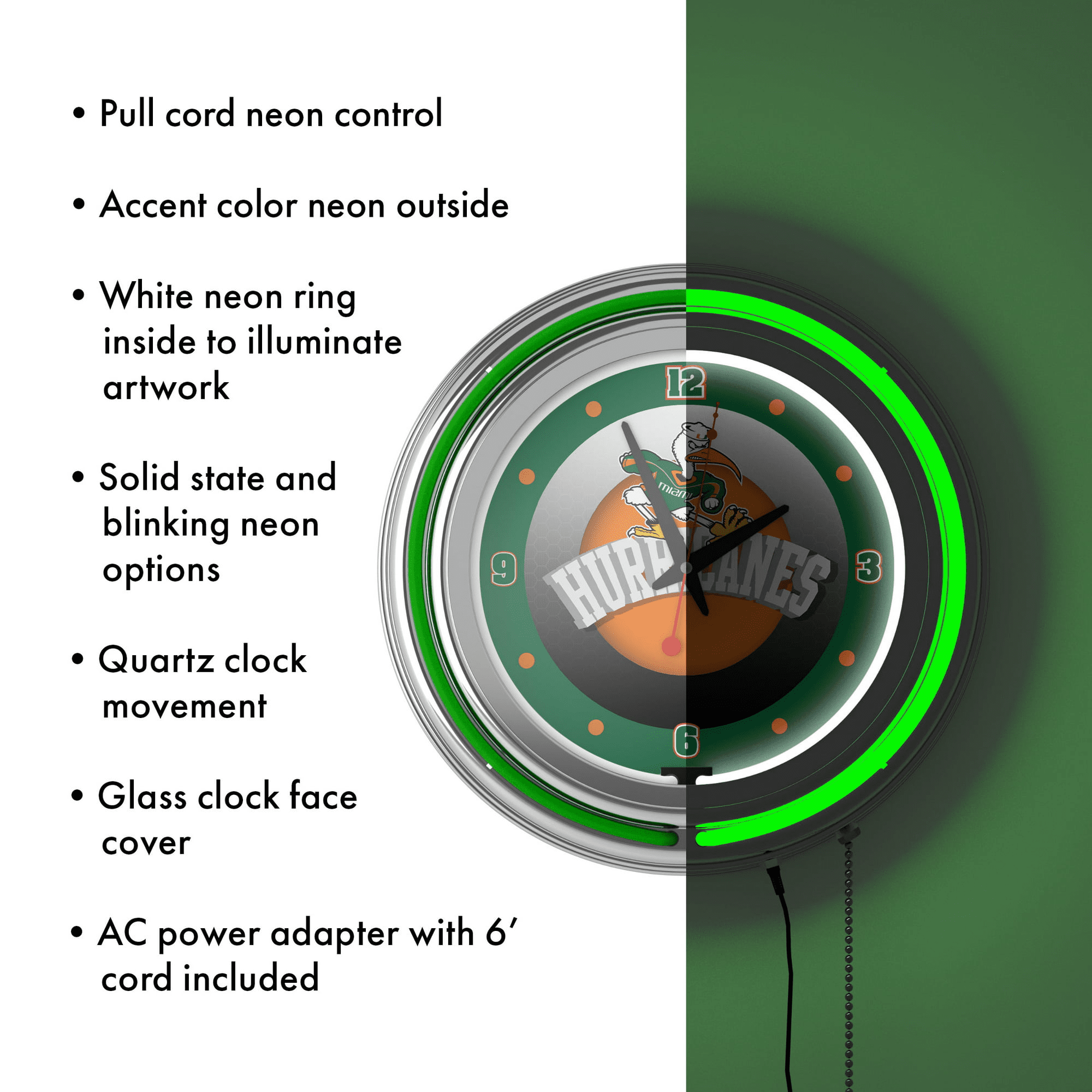 This officially licensed neon wall clock is the perfect addition to any game room, garage or man cave. This impressive clock has two neon rings; one is an accent colored neon ring on the exterior and the other is a brilliant white neon ring on the interior of the clock to light up your favorite logo. Other highlights include chrome finished resin housing and a high-grade glass clock face cover. The battery-operated quartz clock mechanism will keep it ticking for a long time, while the neon runs off the included ac adapter. The neon is controlled by the pull chain and the back of the clock includes a wall hanging mount and has two modes ? Solid state and blinking. The 3? Depth of this clock combined with the radiant shimmer of the neon reflecting off the chrome housing is sure to make this clock pop on any wall!
